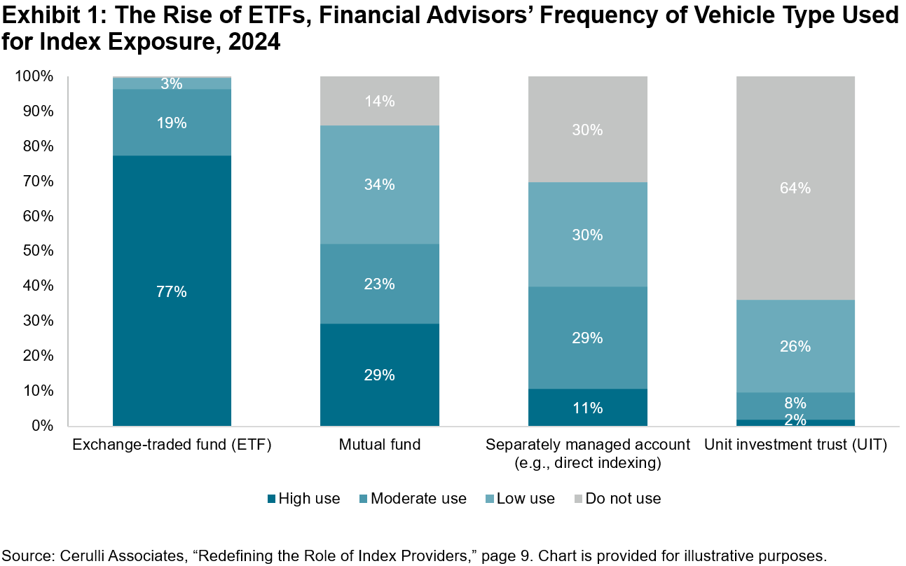 ETFs are the leading vehicles for index-based strategies, with over 75% of advisors reporting high usage, a factor contributing to indexing’s momentum (see Exhibit 1).
