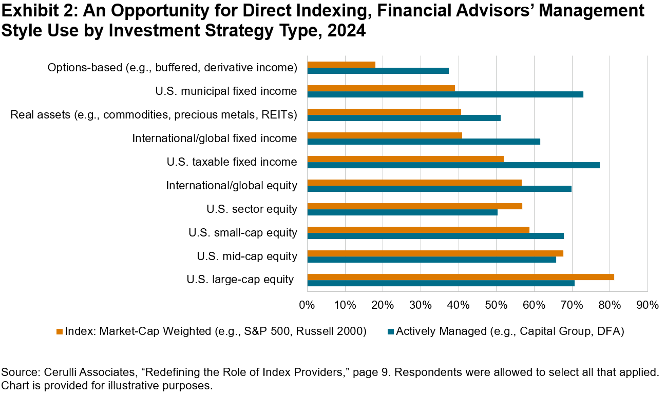Advisors are increasingly using separately managed accounts (SMAs) to track indices while customizing for tax optimization or client preferences. Cerulli Associates has a positive outlook on the potential growth of direct indexing among the affluent and high-net-worth client segments, particularly in equity-based strategies. One reason is that 81% of advisors use index-based strategies for U.S. large-cap equity, where efficiency is prioritized, versus 52% for taxable fixed income, where active approaches are still implemented (see Exhibit 2).6