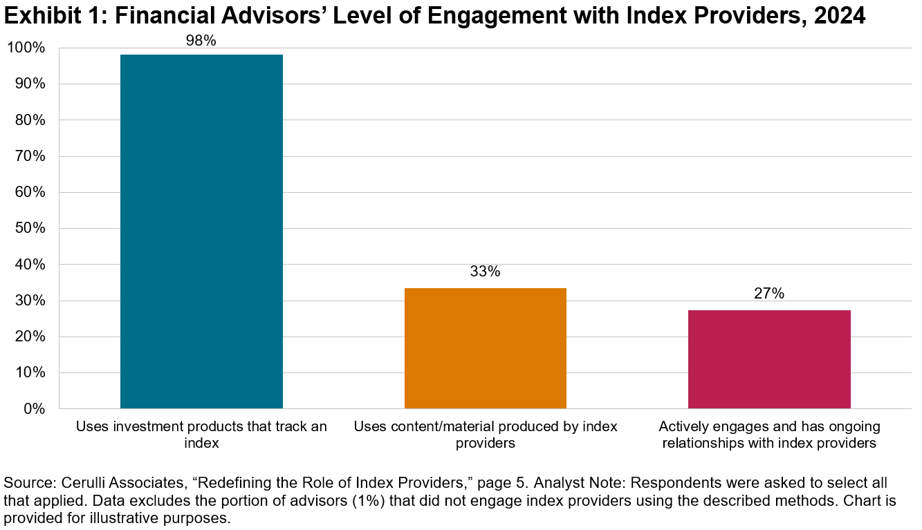 A recent blog examined the forces contributing to the rise of indexing in wealth management. While the vast majority of financial advisors use index-based investment products, most aren’t engaging with index providers in other ways (see Exhibit 1).