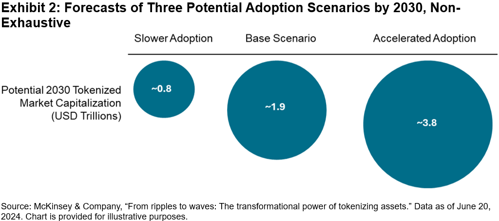 Tokens can both define the asset and specify what can be done with it.7 Additionally, the technology enables fractional ownership, allowing investors to own a portion of an asset rather than the entirety—potentially providing broader access to investment opportunities. By leveraging blockchain technology, tokenization may enhance transparency and operational efficiency, mitigating some of the potential risks associated with traditional asset management, such as errors from manual oversight.