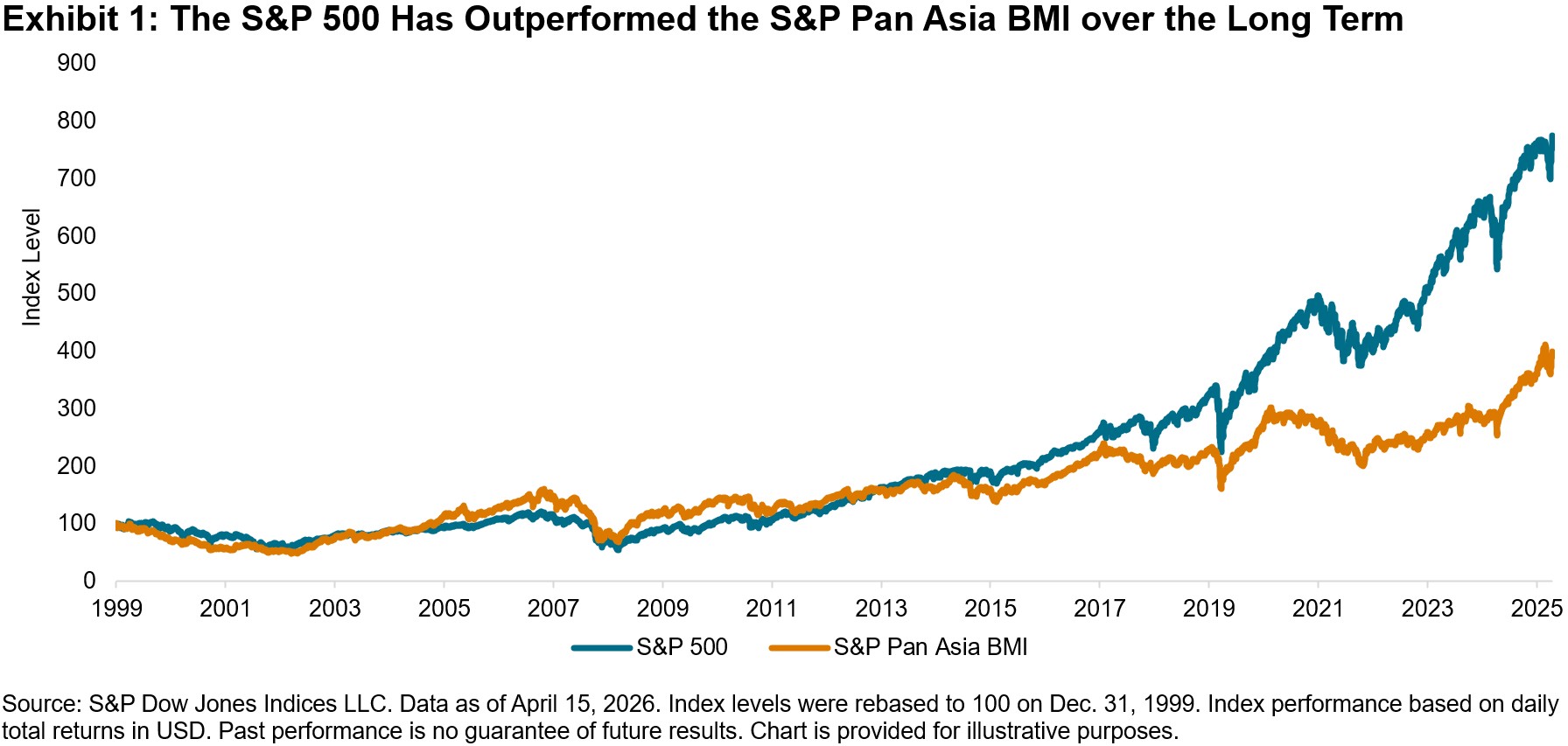 Notwithstanding recent market gyrations, U.S. equities have outperformed their Pan Asian counterparts over the long term,2 with the S&P 500 outperforming the S&P Pan Asia BMI by a cumulative 360% since 2000.