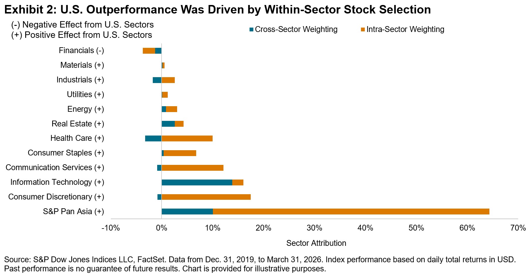 Considering that U.S.-domiciled stocks accounted for a majority of the market cap in 10 of the 11 sectors in the S&P Global BMI as of year-end 2024,3 adopting a sectoral perspective4 can be helpful to understand the sources of U.S. equity outperformance compared with equities in Pan Asia. Exhibit 2 shows that much of this outperformance can be attributed to within-sector stock selection, particularly in the Consumer Discretionary and Communication Services sectors, which house many of the Big Tech names that have dramatically outperformed in recent years.