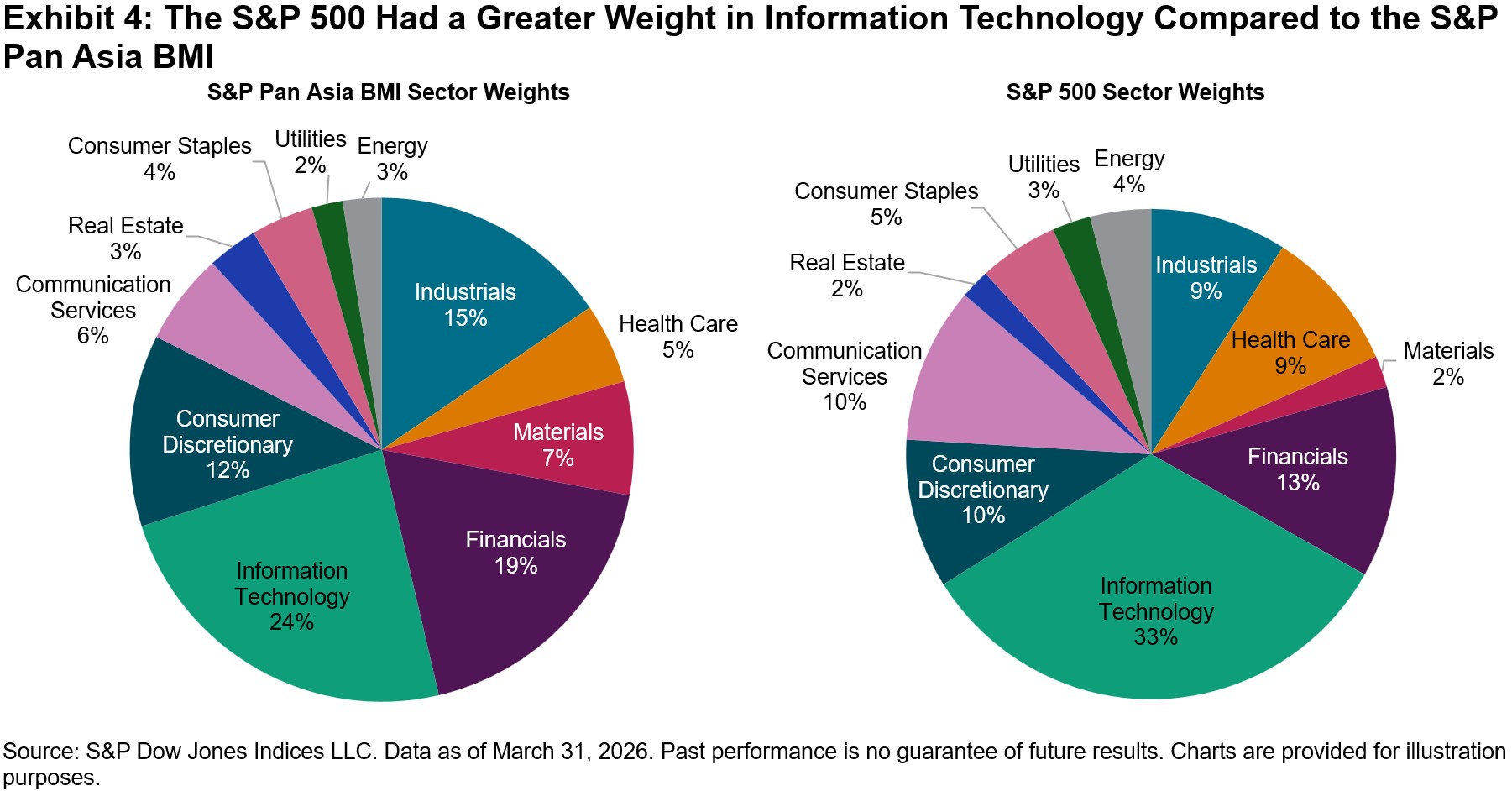 In addition to outperformance from stock selection within sectors, the attribution in Exhibit 2 shows that the U.S. also benefited from selection across sectors, particularly in Information Technology, which contributed more than one-fifth of U.S. outperformance relative to Pan Asia. Exhibit 4 compares the sector weights of the S&P 500 and the S&P Pan Asia BMI. The U.S. had a greater weight in the Information Technology sector, while S&P Pan Asia had greater weights in Industrials and Financials.