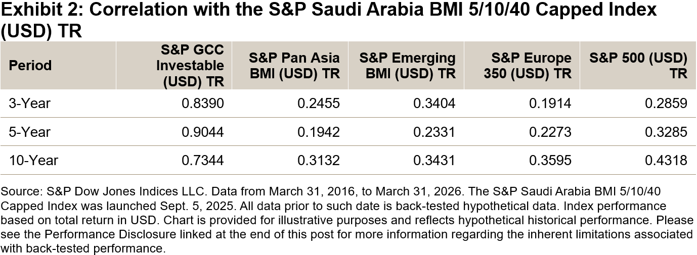 As shown in Exhibit 2, the S&P Saudi Arabia BMI 5/10/40 Capped Index has maintained a low correlation to global and regional benchmarks over time, making it a source of diversification.