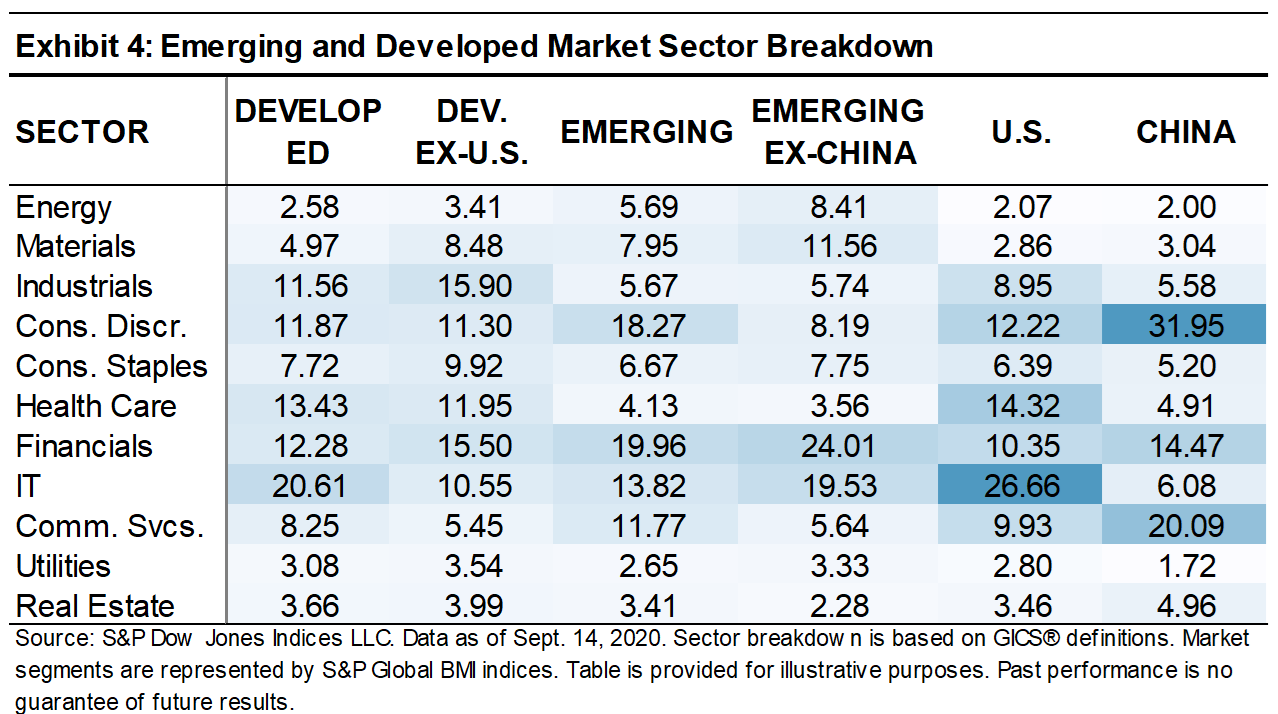 While China’s role in emerging markets may mimic U.S. dominance of the developed markets, from a sectoral perspective there are both similarities and differences. The U.S.’s sizeable ~27% weighting to the IT sector is its largest, while China’s biggest sectors are Consumer Discretionary and Communication Services—which together account for more than 50% (see Exhibit 4).