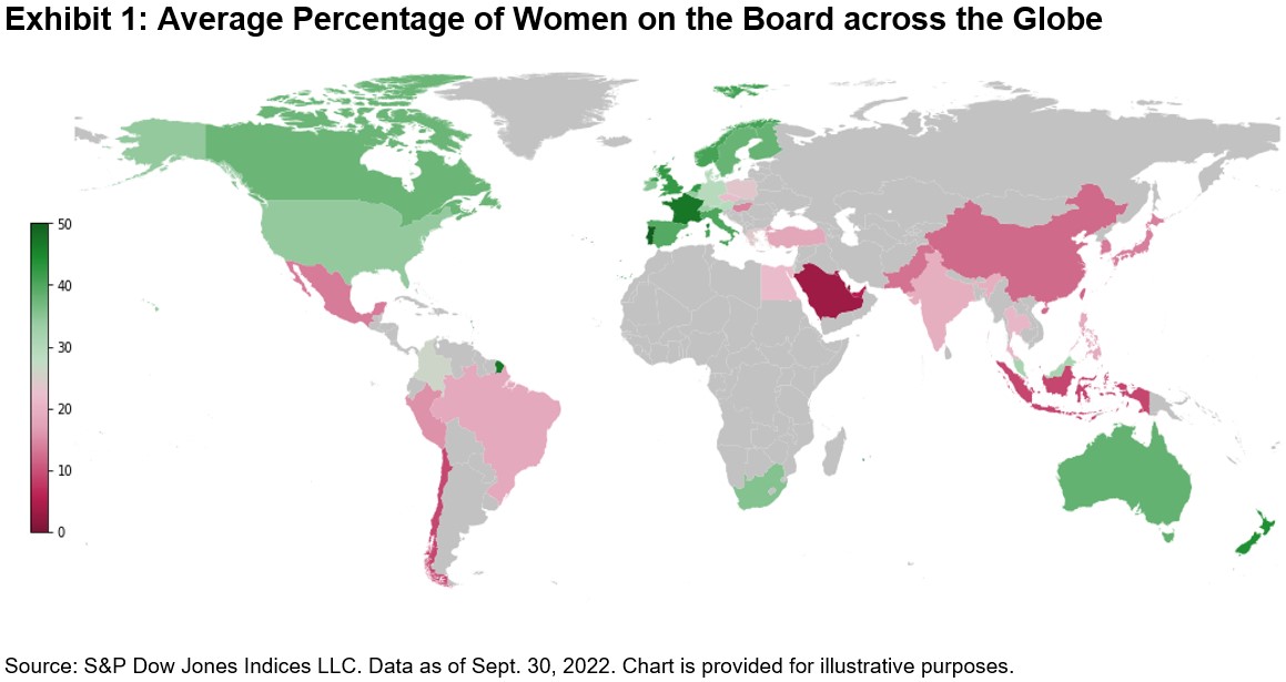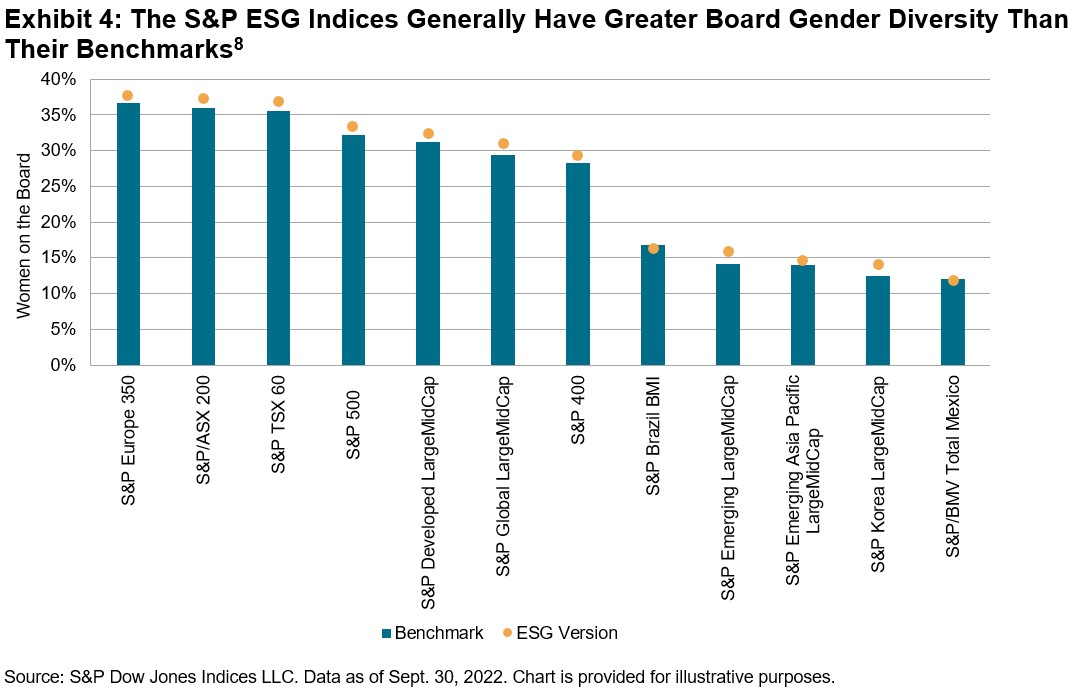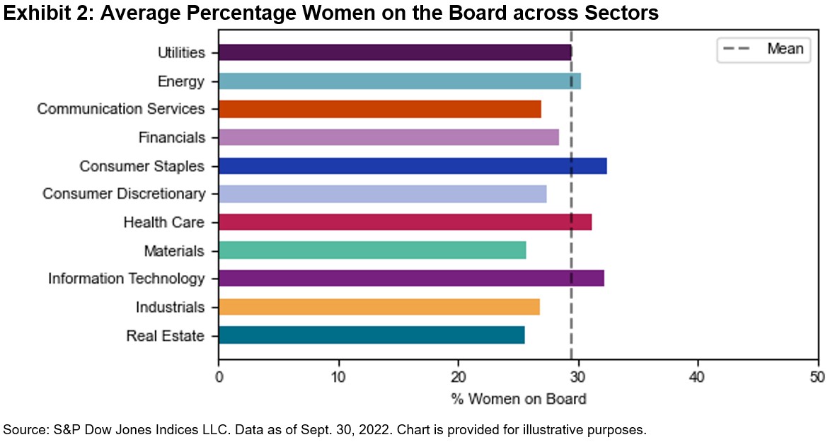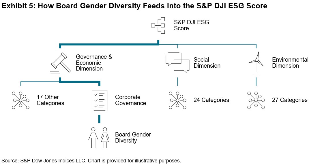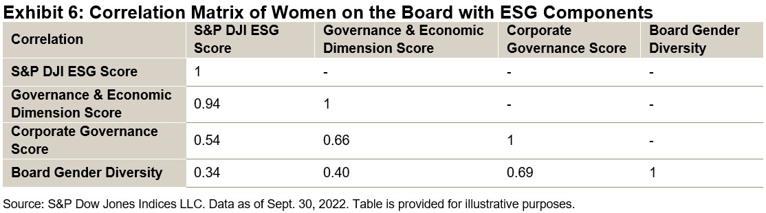 Exhibit 6 demonstrates the influence that women on boards of directors can have on each dimension of a firm’s S&P DJI ESG Score. Even at the overall ESG score level, board gender diversity still plays a part in a company’s overall sustainability rating.