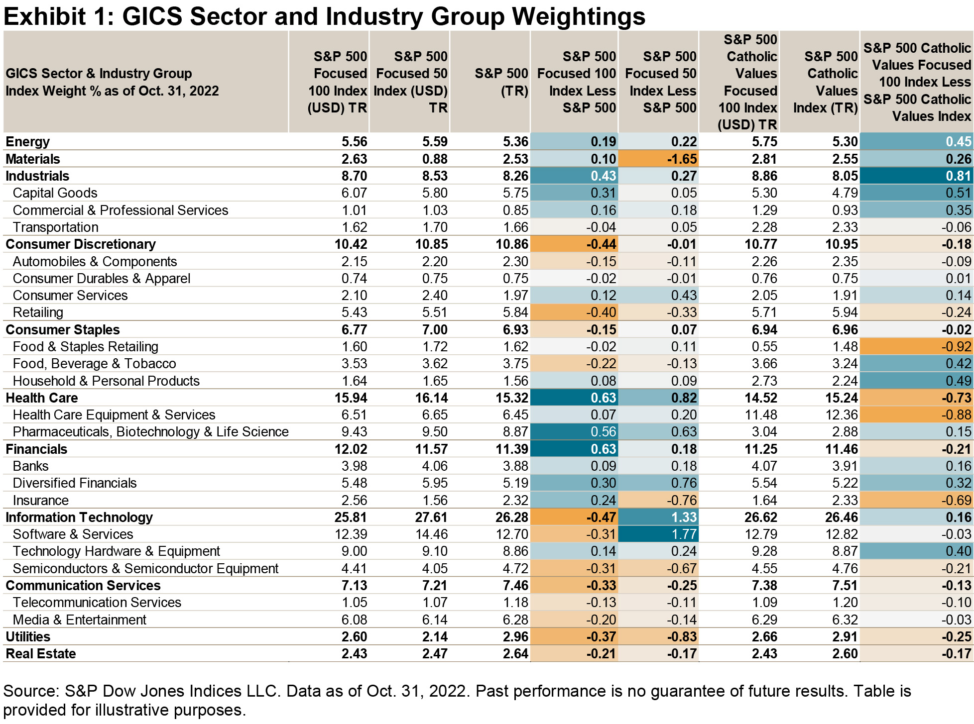 In practice, industries are not distributed evenly across geographies. Exhibit 2 shows that the S&P Europe 350 has significant weight in Industrials and Health Care, reflecting the strong franchises in these sectors in countries such as Germany and France for Industrials and the U.K. for Health Care. The S&P 500 has a higher weight in Information Technology and Communication Services than the European index.
