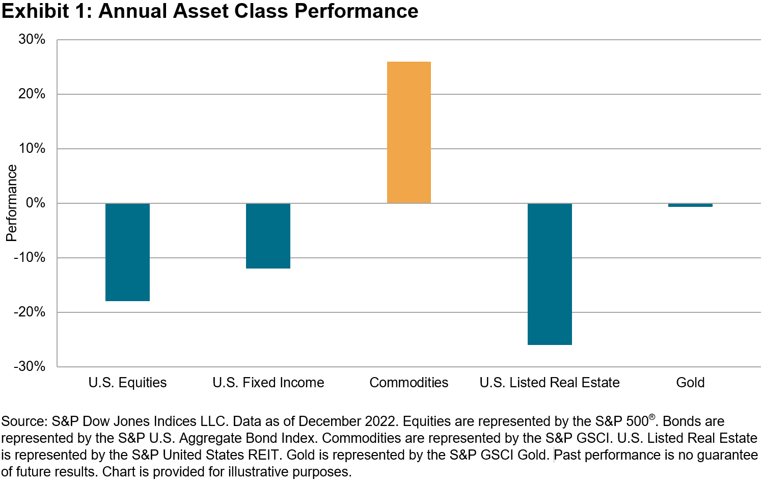 A tumultuous 2022 resulted in the S&P 500 entering a bear market and posting its worst calendar year performance since 2008, down 18%, bringing an end to its three-year winning streak. The picture could have been grimmer had it not been for an early rally in October and November; the S&P 500 was down more than 25% at its worst point. Exhibit 1 shows that the S&P 500’s reached only one all-time high during 2022 (on Jan. 3), the fewest all-time highs in a year since 2012.