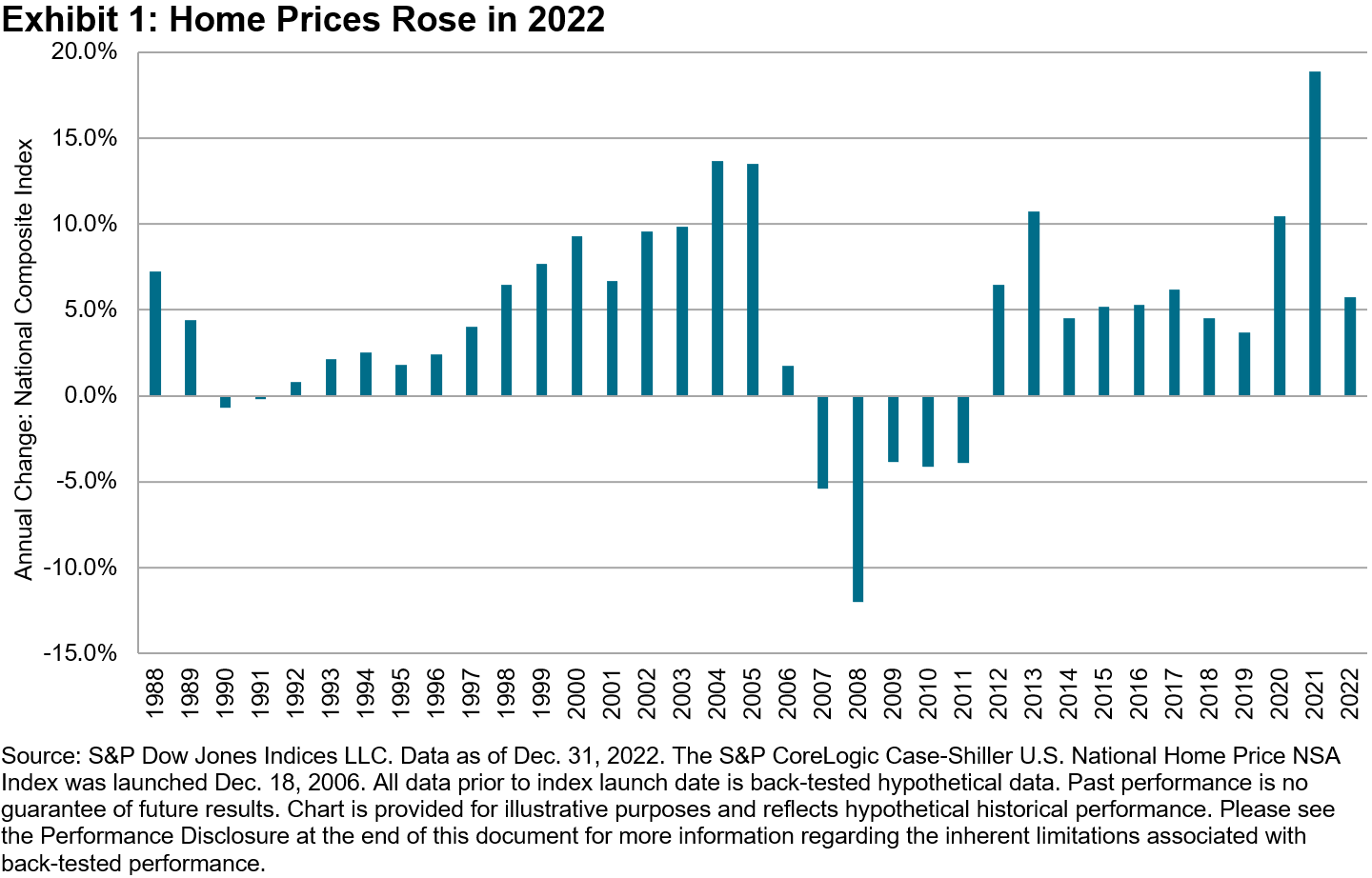 Compared to stock and bond markets, where prices update continuously throughout the trading day, the value of residential real estate is hard to observe; and while one buyer’s shares of stock XYZ are interchangeable with another’s, houses are not similarly fungible. Yet the value of an investor’s house is often a significant component of his net worth, and the aggregate value of real estate is an important indicator of the health of the economy. It’s for these reasons that S&P Dow Jones Indices publishes monthly updates of the S&P CoreLogic Case-Shiller Home Price Indices. We recently published our update for December 2022, which enables us to make some observations about calendar 2022 as a whole.