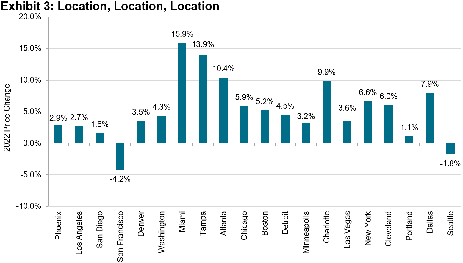 Some urban centers, of course, are more equal than others. In addition to our composite indices, the S&P CoreLogic Case-Shiller family includes data on 20 metropolitan areas, whose 2022 performance is graphed in Exhibit 3. There was an above-average spread between the year’s best performer (Miami, +15.9%) and its worst (San Francisco, -4.2%).