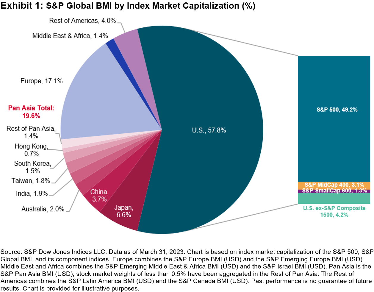 The breadth and depth of the U.S. equity market means that investors risk overlooking a significant chunk of the global equity opportunity set by under-allocating to U.S. equities, which may result in a large active share compared to a global benchmark. For example, Exhibit 1 shows that the U.S. was nearly three times larger than the entire investable Asian equity market, with smaller U.S. equity segments as large as entire local stock markets. The S&P 500® makes up nearly half of the pie, with the S&P MidCap 400® and SmallCap 600® being larger than the Australian and Hong Kong stock markets, respectively.