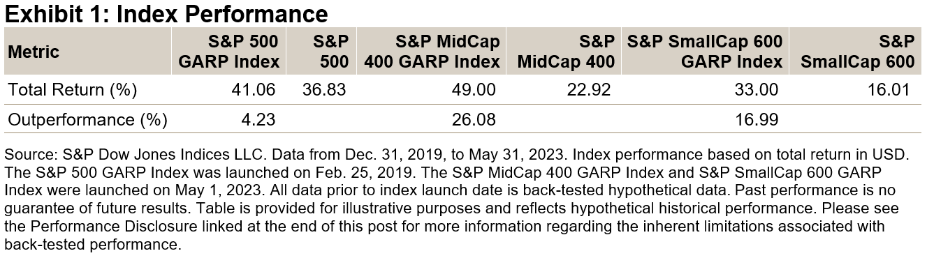 The S&P GARP Index Series strives to select companies with consistent earnings and sales growth, as well as strong earnings power, solid financial strength and reasonable valuation. Since the launch of the S&P 500 GARP Index, global economies have weathered the COVID-19 pandemic and the ongoing Ukraine-Russia conflict. As a result, high inflation and rising interest rates have been hallmarks of this time period. From the beginning of 2020 through to the end of May 2023, it is interesting to note that all three S&P GARP indices have outperformed their corresponding benchmarks (See Exhibit 1) by a wide margin. Therefore, selecting profitable growth stocks with more reasonable valuations has been a worthwhile strategy during this period.