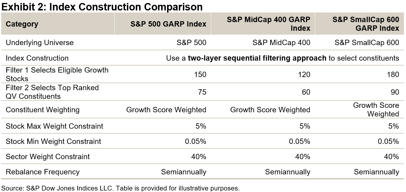 The S&P 500® GARP (Growth at a Reasonable Price) Index was launched in February 2019 to strike a balance between pure growth and pure valuation. Due to its popularity among market participants, this index series has recently been expanded to include the S&P MidCap 400® GARP Index and the S&P SmallCap 600 GARP® Index.