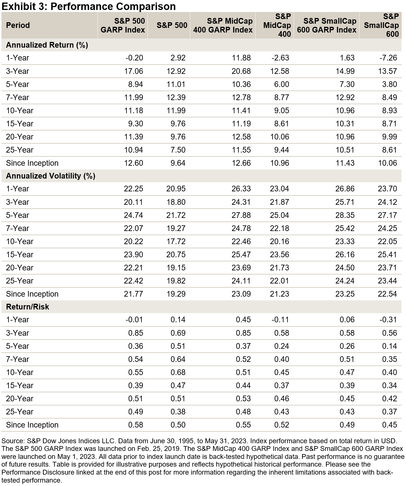Historically, over the long term, the S&P GARP Indices outperformed their corresponding benchmarks in terms of both total and risk-adjusted return. The results show that the approach of selecting profitable growth stocks with reasonable valuations has yielded meaningful results over longer periods. In addition, both the S&P MidCap 400 GARP Index and the S&P SmallCap 600 GARP Index outperformed their corresponding benchmarks for all periods studied (see Exhibit 3).