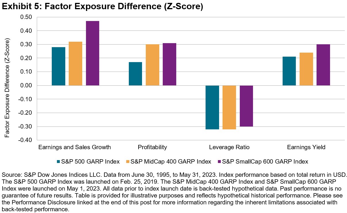 Exhibit 4 shows the historic sector exposure difference between the S&P GARP Indices versus their benchmarks. The S&P GARP Indices have had a noticeable overweight in Consumer Discretionary and an underweight in Financials, Consumer Staples, Utilities and Communication Services.