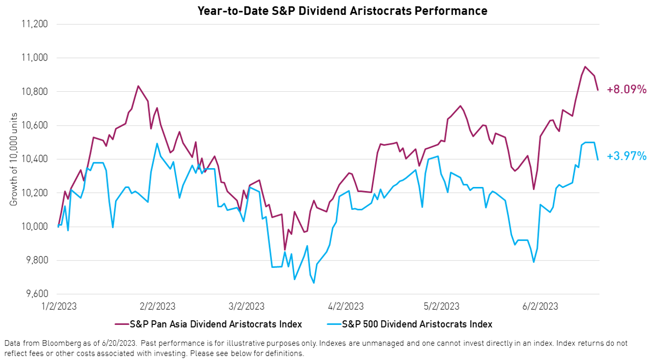 The S&P Pan Asia Dividend Aristocrats Index has outperformed the S&P 500® Dividend Aristocrats Index, which tracks dividend growers in the U.S., so far this year, gaining 8.09% versus 3.97% for its U.S. counterpart, as of June 20, 2023.