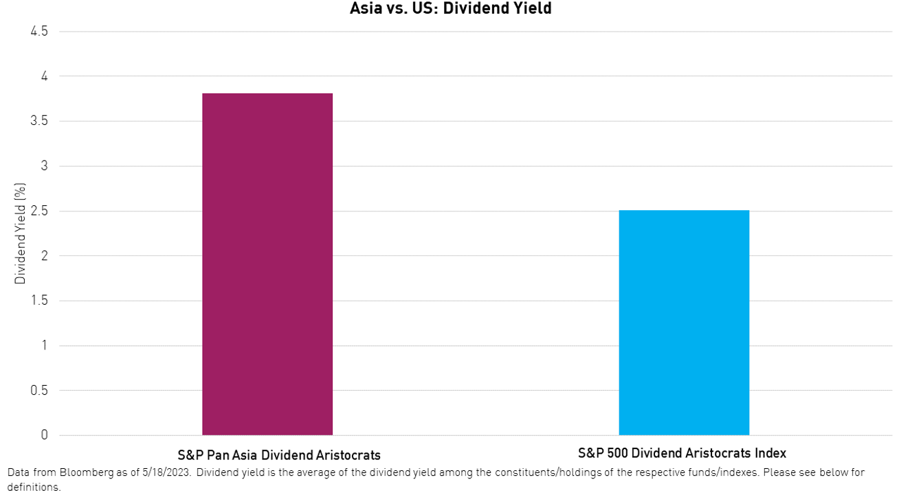 S&P Pan Asia Dividend Aristocrats Index constituents also currently offer a higher dividend yield, on average, than their U.S. counterparts.