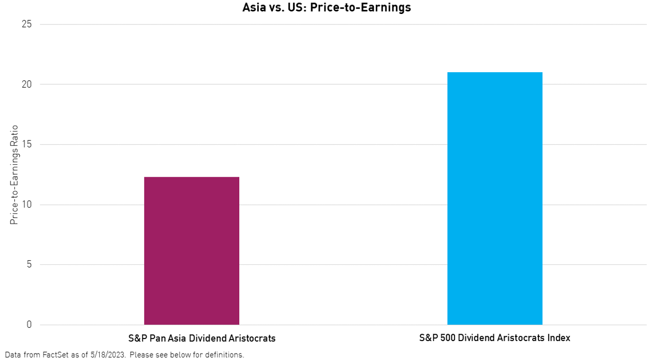 S&P Pan Asia Dividend Aristocrats Index constituents are currently trading at nearly one half of the price-to-earnings multiple of their U.S. counterparts, on average.