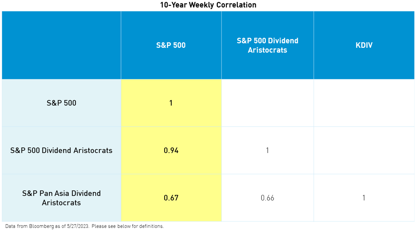 S&P Pan Asia Dividend Aristocrats constituents have also exhibited relatively low correlations to the broad U.S. equity market and the S&P 500 Dividend Aristocrats Index constituents, which may present additional portfolio benefits over the long term.