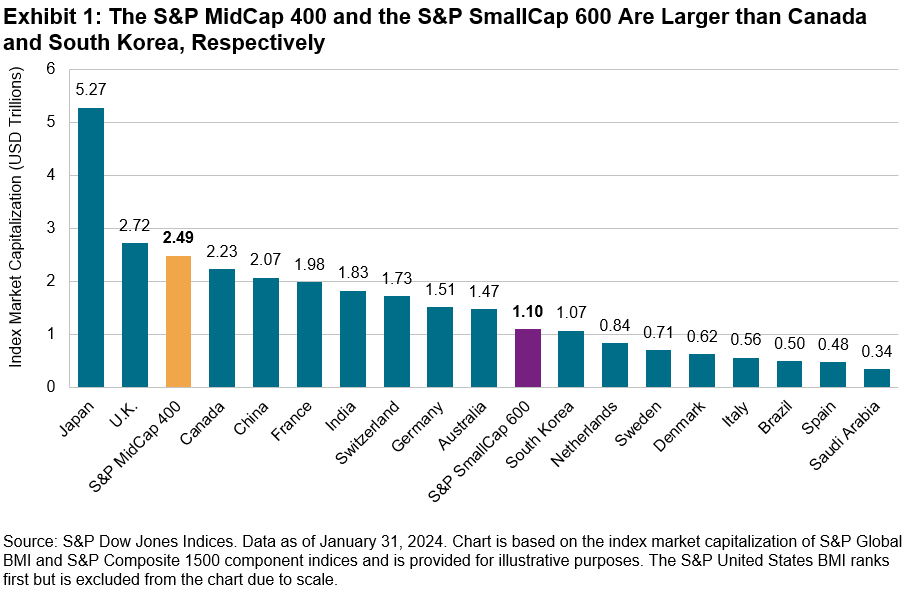 U.S. small and mid caps have benefited from the small- and mid-size equity premium historically, outperforming the S&P 500 over the long run. Historically, there has also been a cyclicality among U.S. equity size ranges. While the S&P 400® and S&P 600® are smaller than large-cap U.S. equities, when looking abroad, the U.S. mid-cap and small-cap markets are equivalent to entire countries’ entire equity markets. Exhibit 1 shows that the S&P 400 would rank as the fourth-largest country in the S&P Global BMI and the S&P 600 is larger than South Korea (all based on float-adjusted market capitalization).