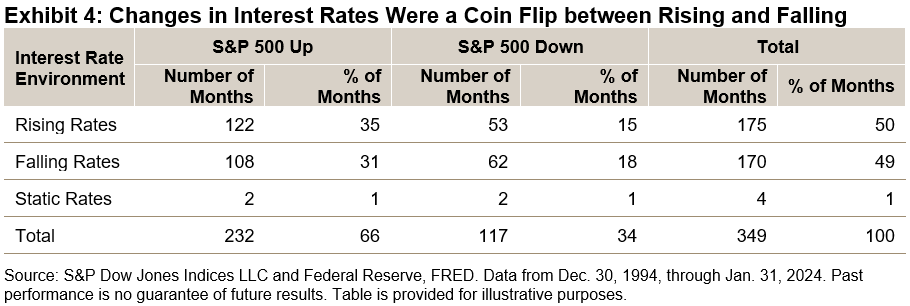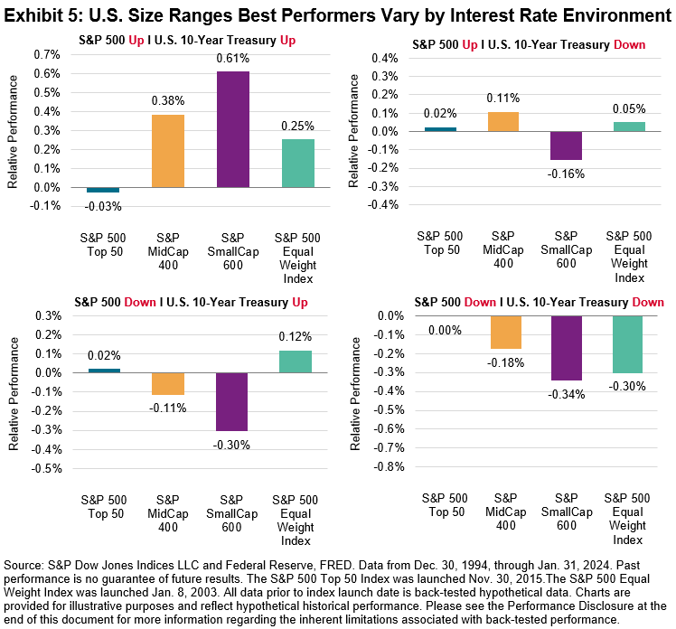 Interest rates may provide a tactical opportunity to diversify the large-cap S&P 500 with the S&P 500 Equal Weight Index, S&P MidCap 400 and S&P SmallCap 600, based on their different relative responses to interest rates under different regimes. Looking at monthly data since December 1994, Exhibit 4 shows that the S&P 500 rose about 66% of the time, while U.S. Treasury rates fell about 49% of the time (almost a coin flip). Current market expectations are of falling rates and a positive market environment, which happened one-third of the time. 2022’s dynamic of a falling stock market and rising rates was rare, occurring in 15% of months.