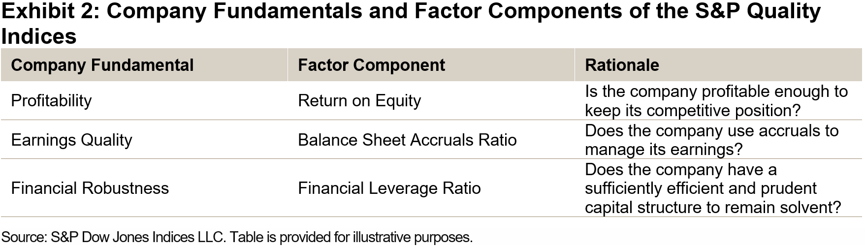 The S&P Quality Developed Ex-U.S. LargeMidCap utilizes the same three prominent metrics as the S&P U.S. Quality Indices. These metrics aim to capture a company’s quality characteristics: strong profitability, high earnings quality and robust financial strength (see Exhibit 2). The index constituents correspond to the top 20% of eligible stocks within the S&P Developed Ex-U.S. LargeMidCap’s universe, ranked by their overall quality scores. These constituents are weighted by the product of their market capitalization and quality scores, subject to country (maximum 40%), sector (maximum 40%) and individual (maximum 5%) holding constraints.1