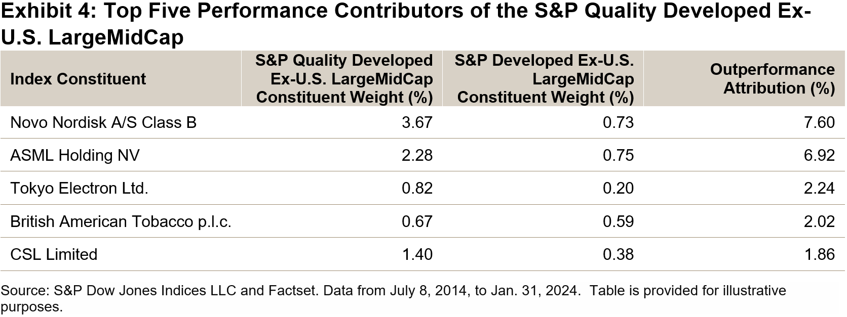 From its launch on July 8, 2014, to Jan. 31, 2024, the S&P Quality Developed Ex-U.S. LargeMidCap had a cumulative return of 71.19% (with an annualized volatility of 14.3%) versus a cumulative return of 51.87% (with an annualized volatility of 14.2%) for its benchmark. The outperformance of 19.32% was mainly from the top five contributors that were largely from the Information Technology and Health Care sectors (see Exhibit 4).