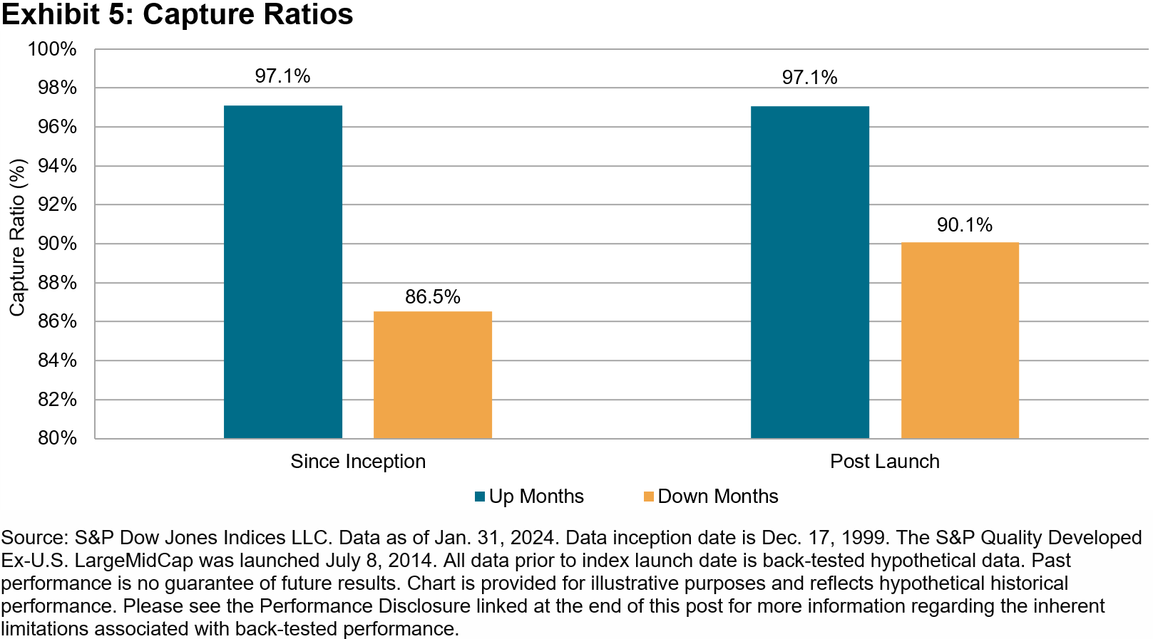 The historical capture ratios in Exhibit 5 show that the S&P Quality Developed Ex-U.S. LargeMidCap tended to participate one-for-one in up markets,2 while delivering significant outperformance during down markets. Such features held true for the whole period since the index inception date and post-launch period. These unique characteristics make sense, since quality indices are designed to track companies with durable business models and sustainable competitive advantages.