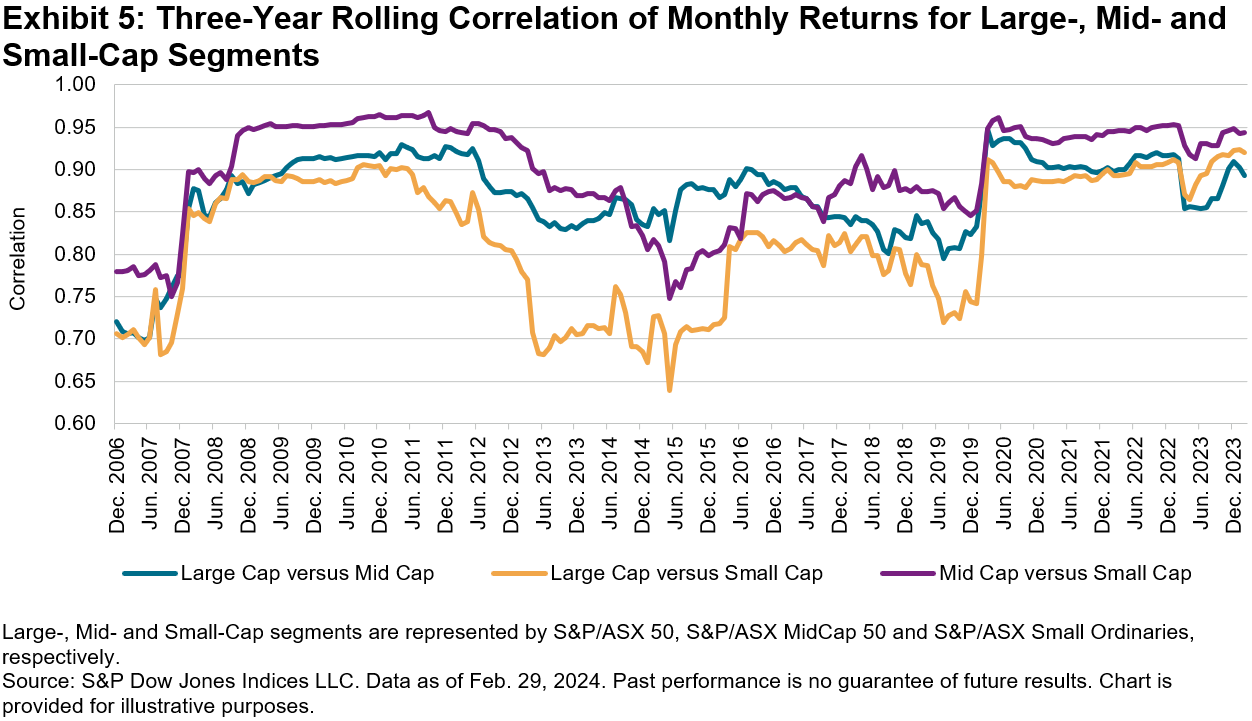 The S&P/ASX MidCap 50 underperformed the S&P/ASX 50 by more than 5% in 2023, which was a period characterized by rising interest rates, where investors valued quality and dividends offered by more established large caps. However, over a full economic cycle, as shown by the 5- and 10-year performance figures, the mid-cap segment has outperformed large caps and the broad market (see Exhibit 4).
