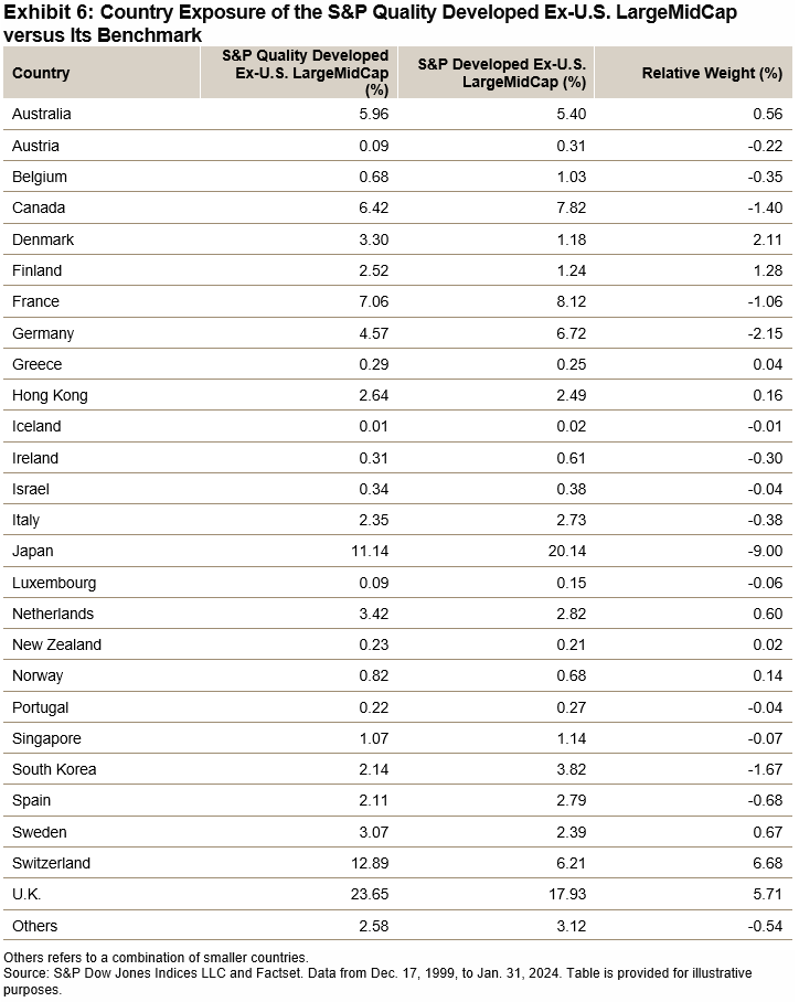 In Exhibit 6, we investigate the country allocation of the constituents in the S&P Quality Developed Ex-U.S. LargeMidCap and its benchmark. From Dec. 17, 1999, to Jan. 31, 2024, the index mainly overweighted Switzerland (6.68%) and the U.K. (5.71%) while underweighting Japan (-9.00%) and Germany (-2.15%).