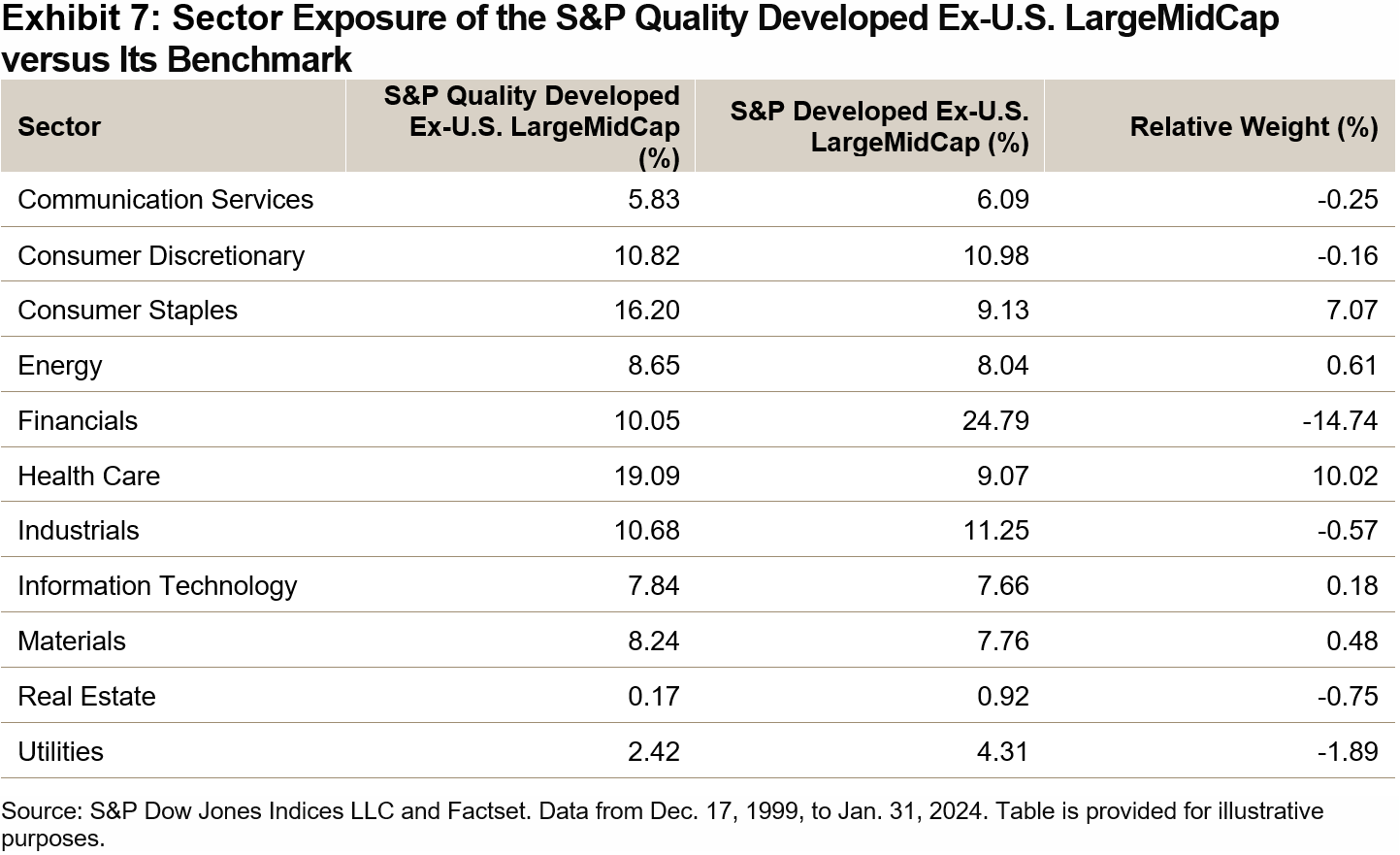 We next explore the sector exposure of the S&P Quality Developed Ex-U.S. LargeMidCap. As seen in Exhibit 7, the index historically has had a significant overweight in Health Care (10.02%) relative to its benchmark, with a large underweight in Financials (-14.74%).