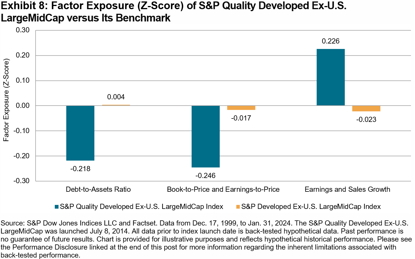 Exhibit 8 shows the factor exposure of the S&P Quality Developed Ex-U.S. LargeMidCap versus its benchmark in terms of the Axioma World-Wide Ex-US Risk Model3 Factor Z-scores. The quality index demonstrated strong quality and growth tilts versus its benchmark. Specifically, the quality index had lower exposures to leverage ratio and value factors, with a higher exposure to growth than its benchmark.