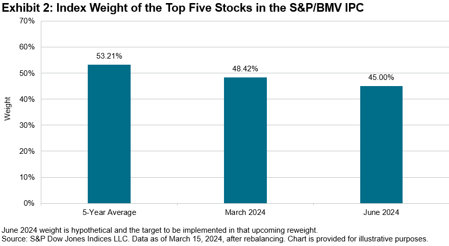 The main objective of these changes was to improve diversification by reducing stock concentration in the index. Exhibit 2 shows how the top five stocks represented about 53% of the index’s weight on average over the past five years and the impact of the first phase of the implementation during the March 2024 rebalance.