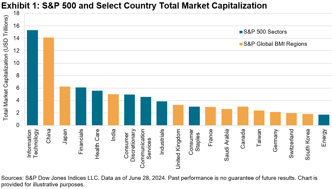 While the S&P 500’s USD 45 trillion total market cap reflects the U.S.’s position as the largest equity market in the world, individual S&P 500 sectors are also prominent, with many surpassing the total market cap of major single-country equity markets, as shown in Exhibit 1.