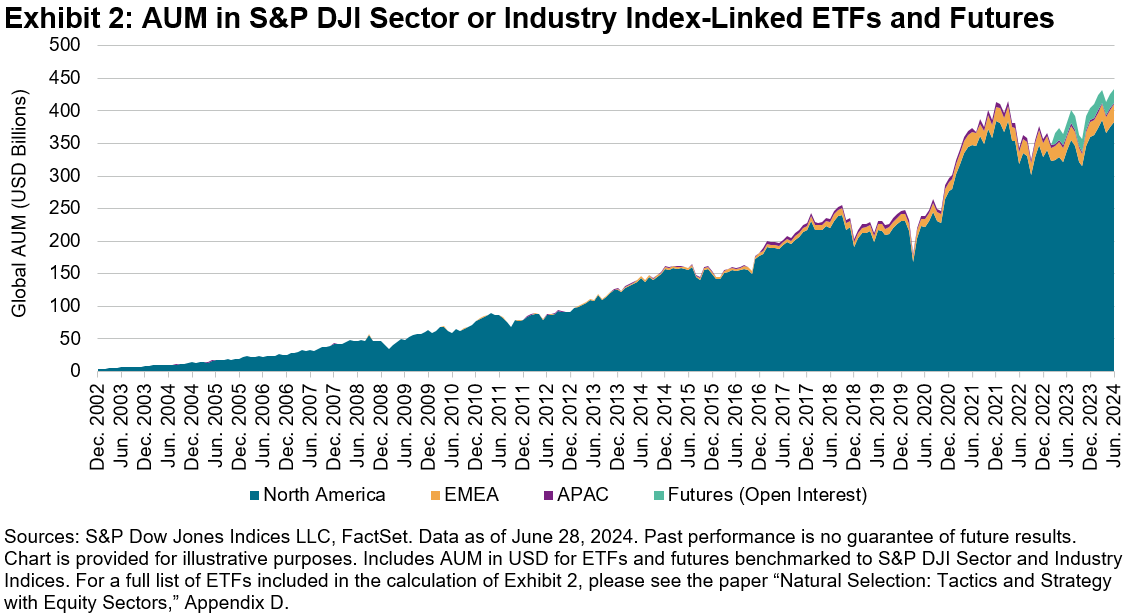 Since their inception, the use of S&P 500 Sector Indices as benchmarks for products has become increasingly widespread around the world. From the Middle East to the U.K., Japan and beyond, possible applications of S&P 500 sectors range from avoiding home bias and diversifying sector exposures to driving performance through tactical and strategic sector tilts. For evidence of the continuing growth of sector applications, one need not look further than the aggregate assets under management (AUM) in globally domiciled sector and industry index instruments (exchange-traded funds [ETFs] and futures), as shown in Exhibit 2.