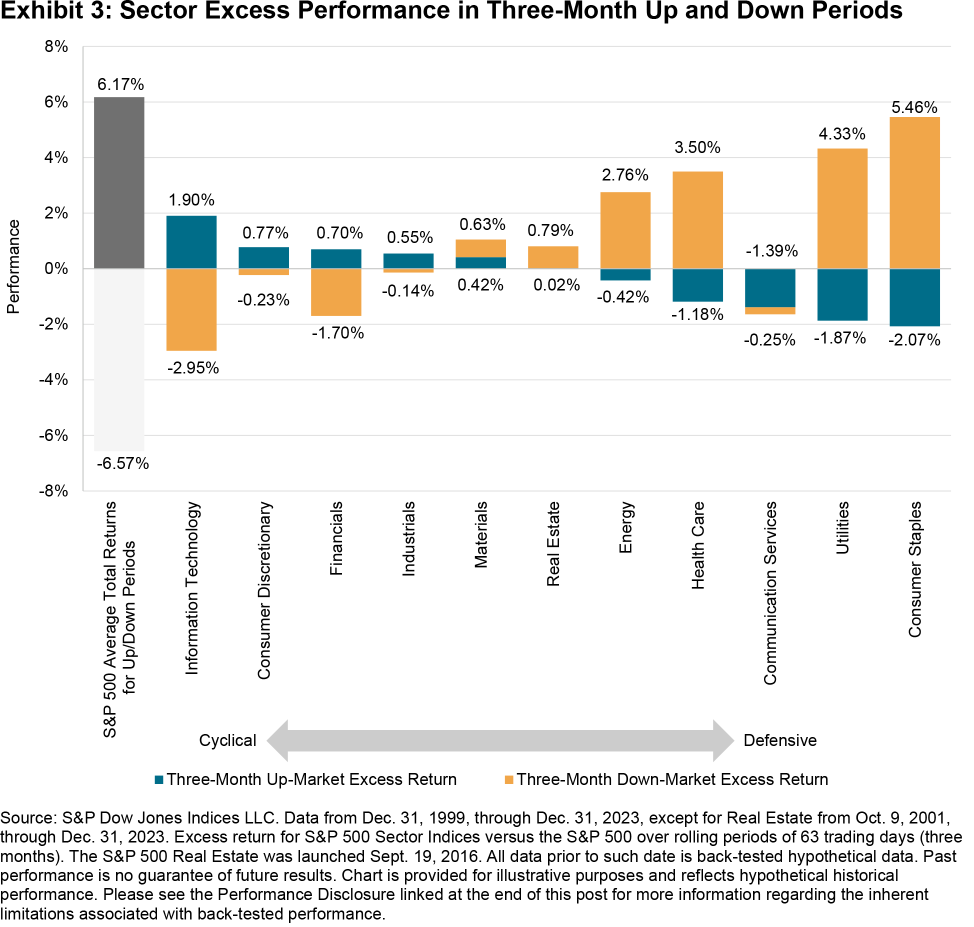 For example, categorization of sectors into cyclical groupings (those that have historically tended to exhibit higher beta and outperform during expansions) and defensive groupings (those that have tended to exhibit lower beta and outperform during declines) can also be effective. Categorizing sectors into defensive or cyclical groups based on ranking their risk attributes and their excess returns during rising or falling markets can offer insight into the potential outcome of sector tilts that historically achieve relatively better performance in each environment. Exhibit 3 illustrates this point, showing the average rolling three-month excess performance of S&P 500 sectors during periods when the S&P 500 was rising or falling.