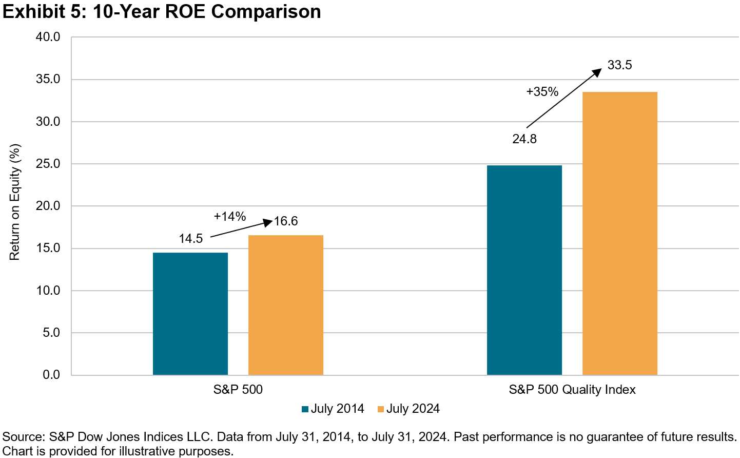 For the 10-year period ending July 31, 2024, the S&P 500 generated a historically strong 13.14% annualized return (see Exhibit 1). Perhaps even more remarkable, however, is the S&P 500 Quality Index’s 13.28% annualized return, considering its defensive attributes that generally result in lower volatility.