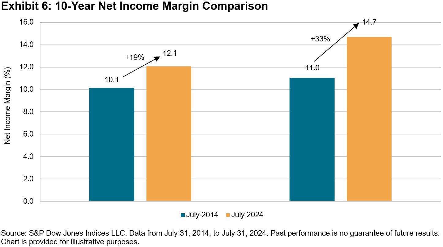 Exhibits 5 and 6 showcase the improved return on equity (ROE) and net income margin of the median constituent of the S&P 500 Quality Index over the last 10 years. The S&P 500 Quality Index’s median constituent increased its ROE from 24.8% to 33.5%, representing a 35% improvement. In comparison, the S&P 500’s median constituent saw a more modest increase in ROE, from 14.5% to 16.6%, representing a 14% improvement. A similar trend is observed in the improvement of net income margin, with the median constituent in the S&P 500 Quality Index improving by 33%, versus 19% for the S&P 500.