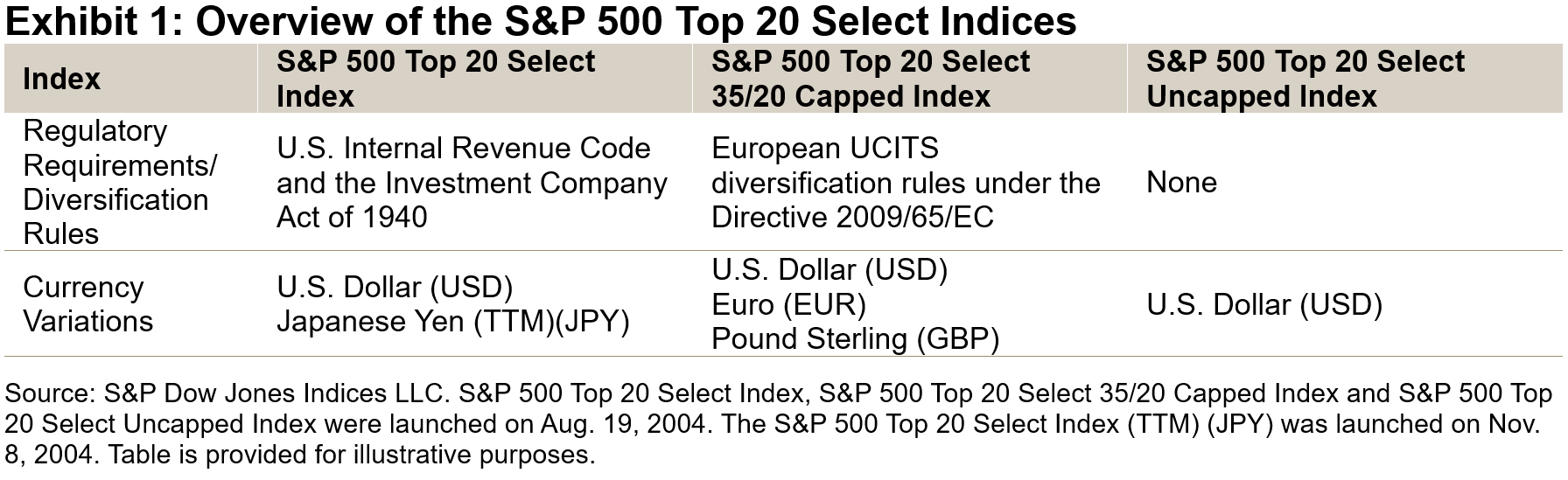 The S&P 500 Top 20 Select Index series currently comprises three headline indices: the S&P 500 Top 20 Select Index, the S&P 500 Top 20 Select 35/20 Capped Index and the S&P 500 Top 20 Select Uncapped Index.