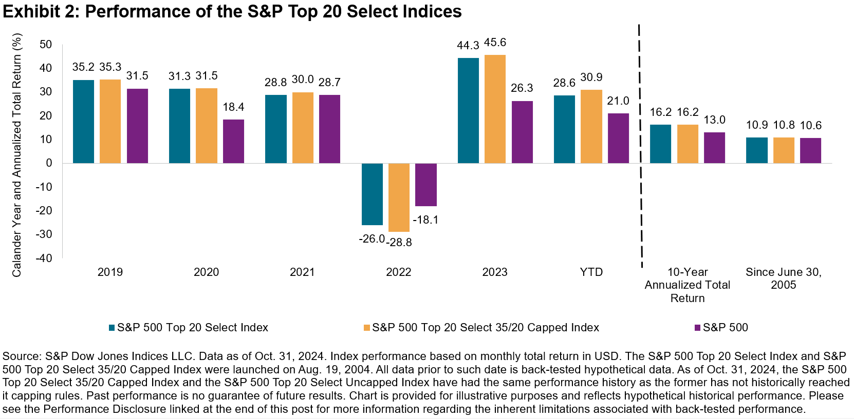 The S&P 500 serves as the benchmark for the large-cap market segment, while the S&P 500 Top 20 Select Index series focuses on the top 4% of the companies by count. The S&P 500 Top 20 Select Index series has outperformed the S&P 500 in the past five years, except for 2022, as well as over longer time horizons (see Exhibit 2).