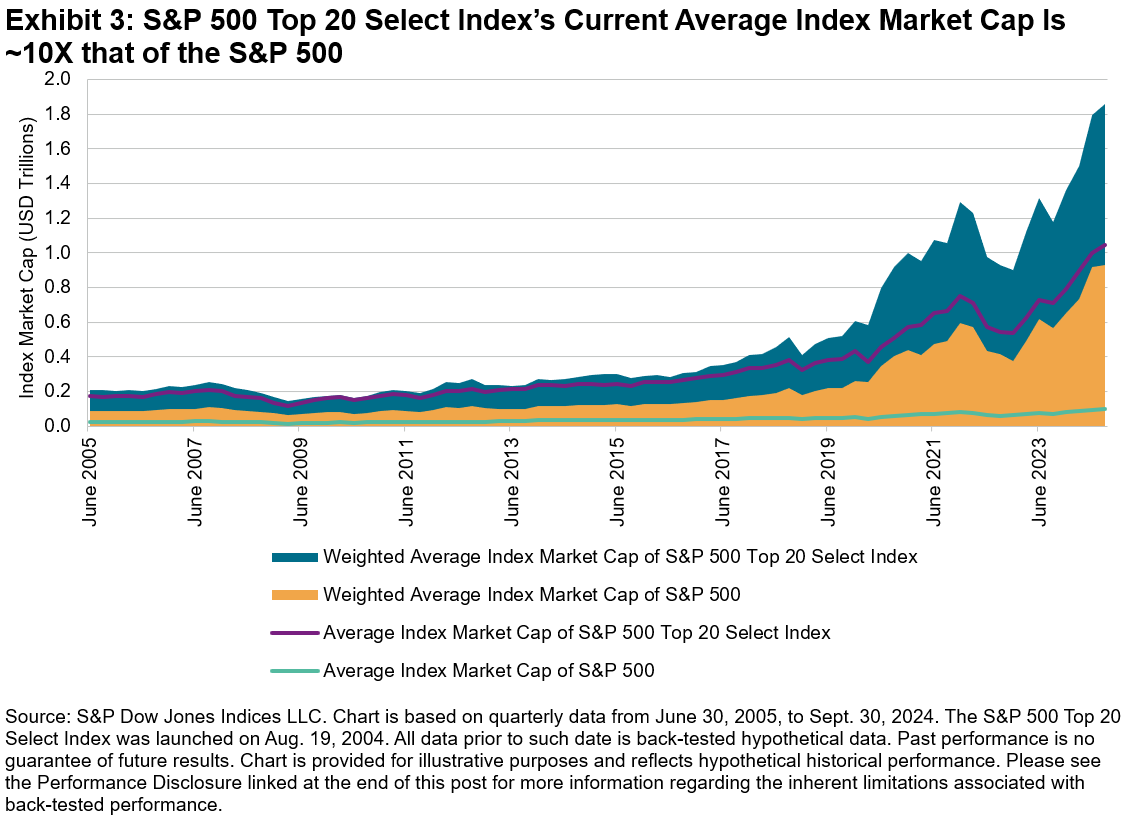 Some similar mega-cap index offerings, such as the S&P 500 Top 10 Index, the S&P 500 Top 20 Index and the S&P 500 Top 50 Index, use float-market cap (FMC) weighting with annual reconstitution. While performance may improve when the largest companies have higher weights in FMC indices, this can amplify concentration. By introducing capping mechanisms, the S&P 500 Top 20 Select Index Series helps increase diversification and reduce concentration risks.