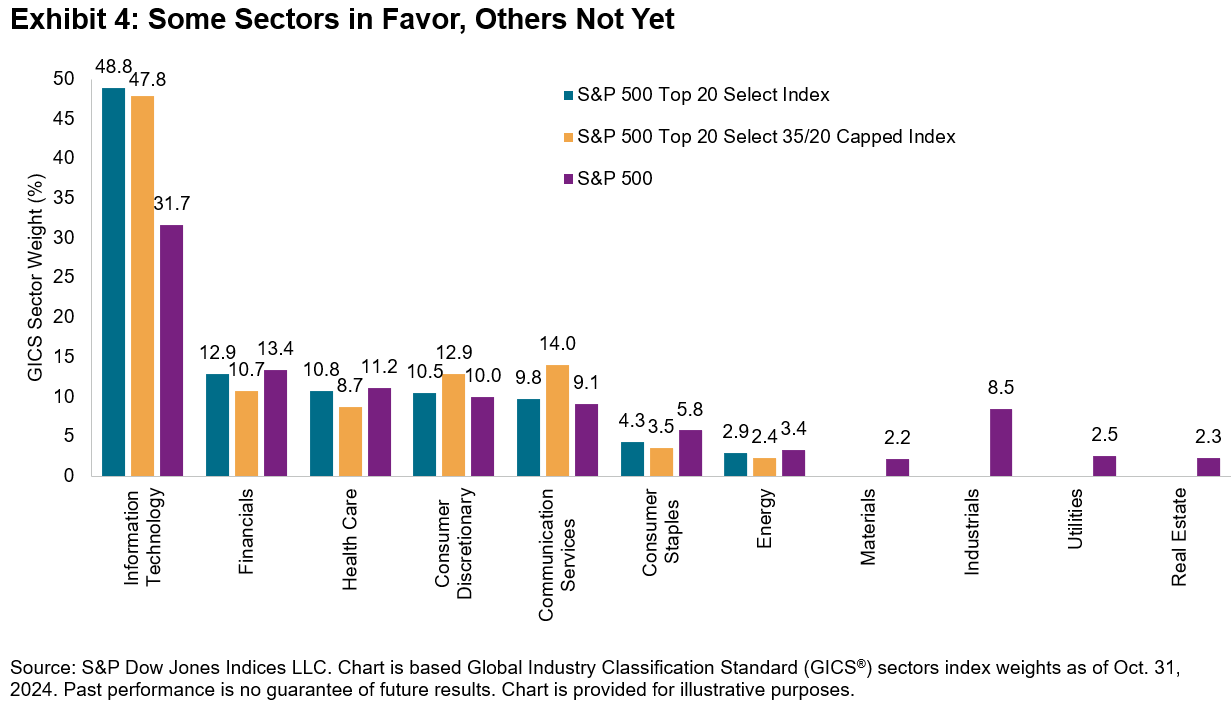 Perhaps unsurprisingly, the S&P 500 Top 20 Select Indices all had similar cumulative returns, as only a handful of mega-cap stocks would have exceeded the capping thresholds historically. Although these indices trailed the S&P 500 for a period after the 2008 Global Financial Crisis, their outperformance after the COVID-19 pandemic reflected the overweighting in the Information Technology sector (see Exhibit 1).