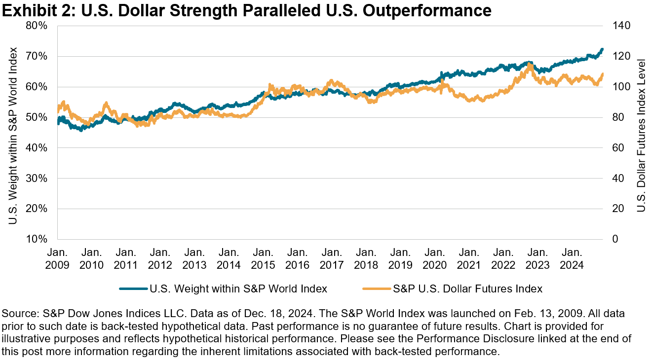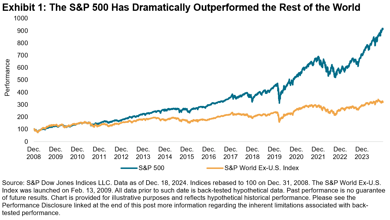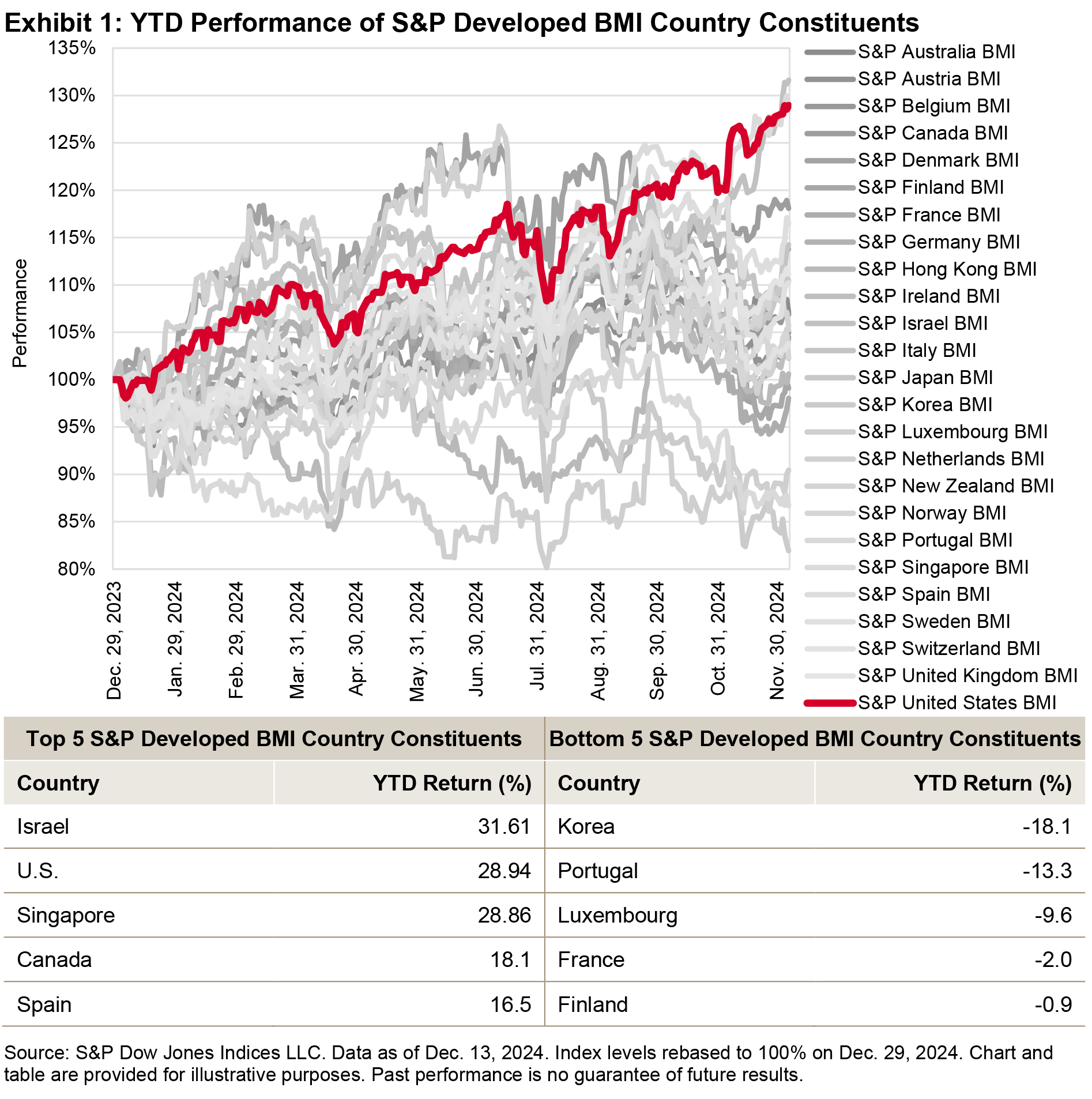 With just a few trading days left in 2024, the S&P Developed BMI has gained 22% YTD as of Dec. 13, 2024, with all but 3 of its 25 members lagging the benchmark. Five regions produced outright losses YTD, with Korea at the bottom of the list, down 18%. Of the remaining 20 markets, 10 produced returns in the single-digit percentages, and only 3 (the U.S., Singapore and Israel) were up over 20%.