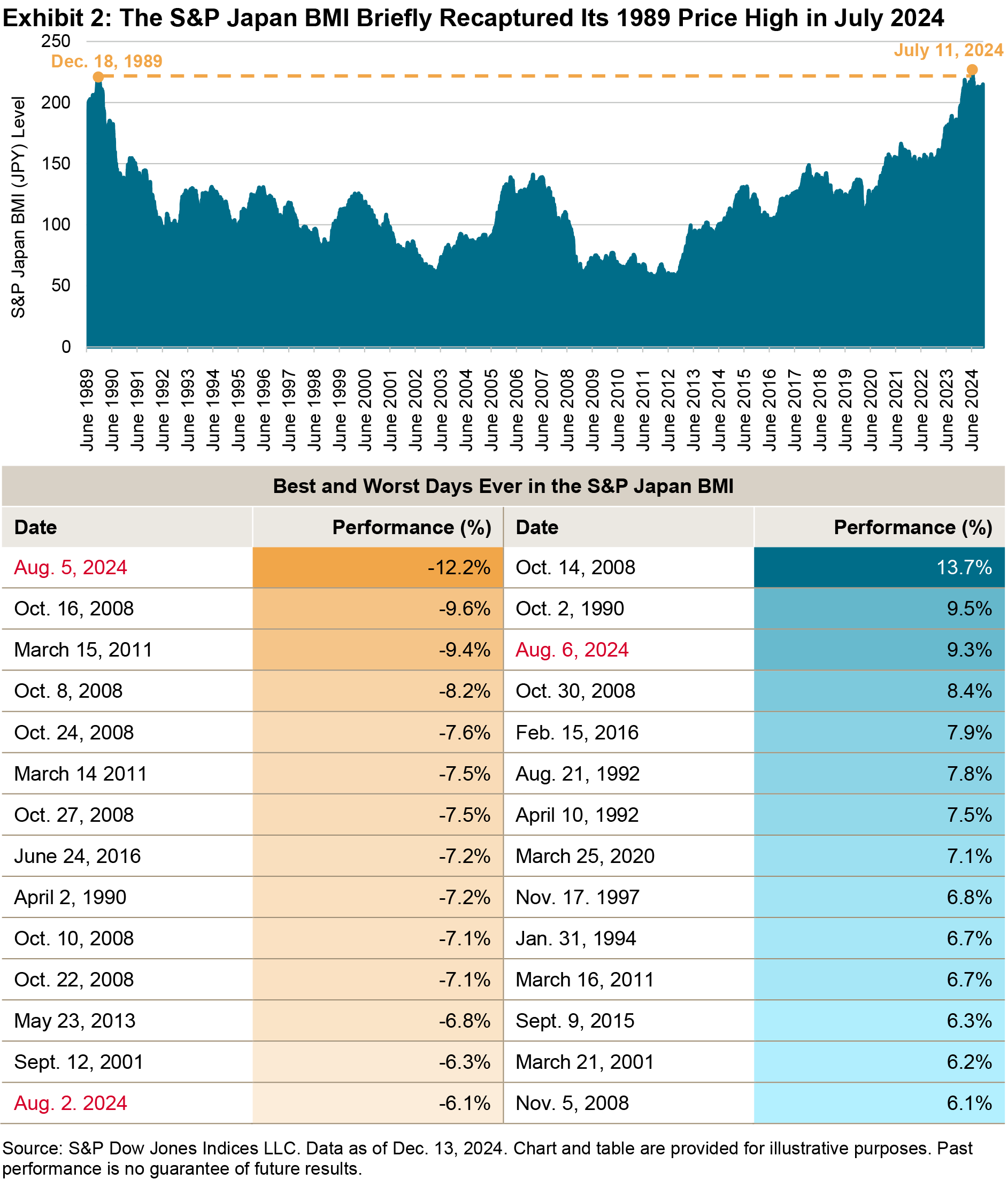 In the beginning of August, the Bank of Japan surprised market participants with an unexpected monetary tightening at a time when the world’s other major central banks were already in easing mode. The Bank of Japan’s action triggered turmoil in capital markets around the world, with Japan at the epicenter. The Japanese yen had aggressive moves in both directions, and so did the S&P Japan BMI, which had its worst one-day loss ever on Aug. 6, 2024, falling over 12%, followed by its third-best day ever the next day as the Bank of Japan made a policy U-turn. Markets have calmed since the early August volatility, and the Japanese benchmark rebounded 24% from its Aug. 5 lows to show a YTD gain of 18%.