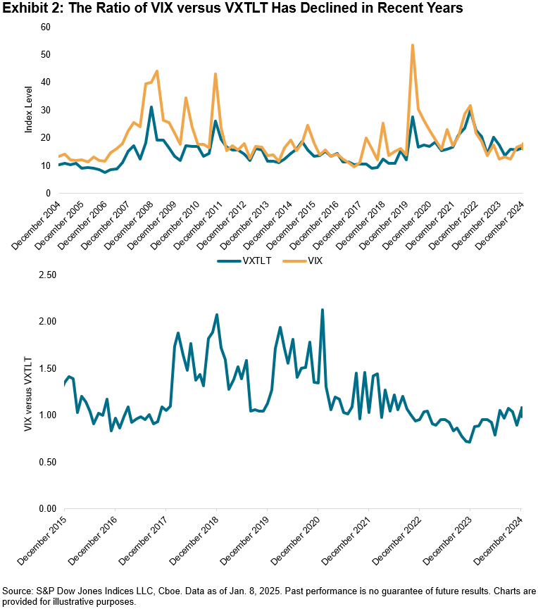 But how does the volatility of the bond market compare to that of the equity market? The first chart in Exhibit 2 shows that VXTLT levels typically have sat below those of the Cboe Volatility Index® (VIX®), a widely known measure of expected equity market volatility. However, while there was a small tick upward in 2024, the differential between the two has generally declined since 2020, as portrayed by the second chart in Exhibit 2, which calculates the ratio in VIX compared to VXTLT. Notable catalysts include uncertainty stemming from the pandemic and Fed rate hikes beginning in 2022 driving up bond implied volatility, coupled with relatively low equity implied volatility.