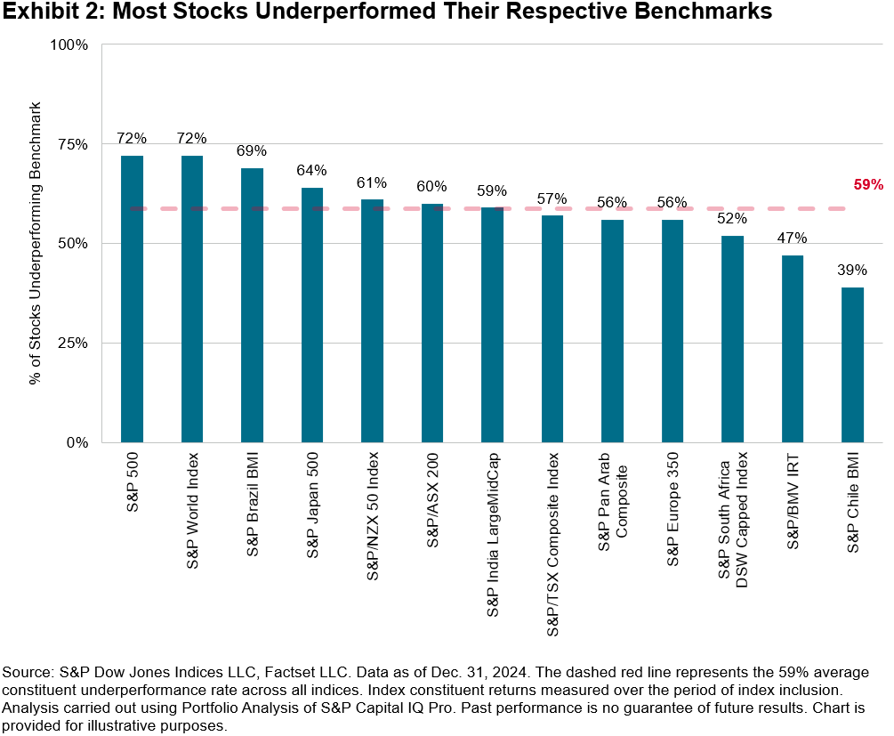 The challenge of stock selection was not a phenomenon unique to the U.S. in 2024—it was also observed globally, as 59% of stocks on average failed to beat their respective benchmarks globally (see Exhibit 2). Chile, Mexico and South Africa were bright spots, with only 39%, 47% and 52% of stocks underperforming their respective benchmarks, coinciding with majority outperformance rates in two of the three regions: Mexico and South Africa.