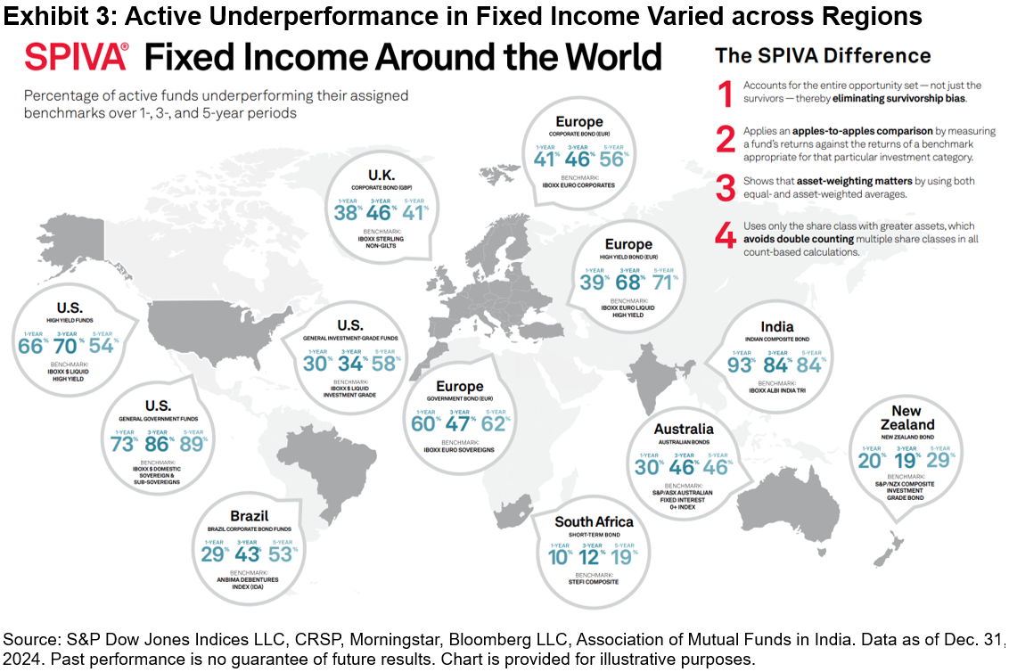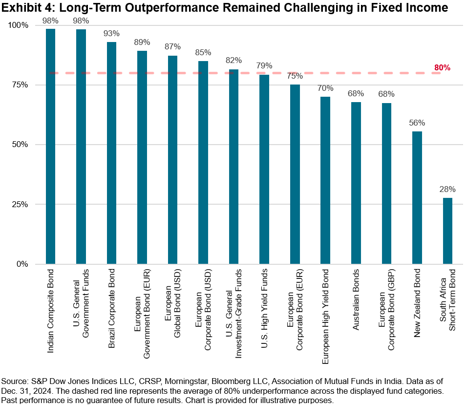 While generating outperformance was tough for stock pickers, fixed income managers performed relatively better than their equity peers, with only 48%2 of funds listed across all regions in Exhibit 3 underperforming their respective benchmarks. In the U.K., German and U.S. bond markets, the beginning of 2024 saw heightened interest rates and an inverted yield curve that disinverted throughout the year. Bond managers who shortened their duration exposures may have been the benefactors of such an environment. Exhibit 3 shows underperformance rates by region for selected fixed income fund categories across 1-, 3- and 5-year horizons.