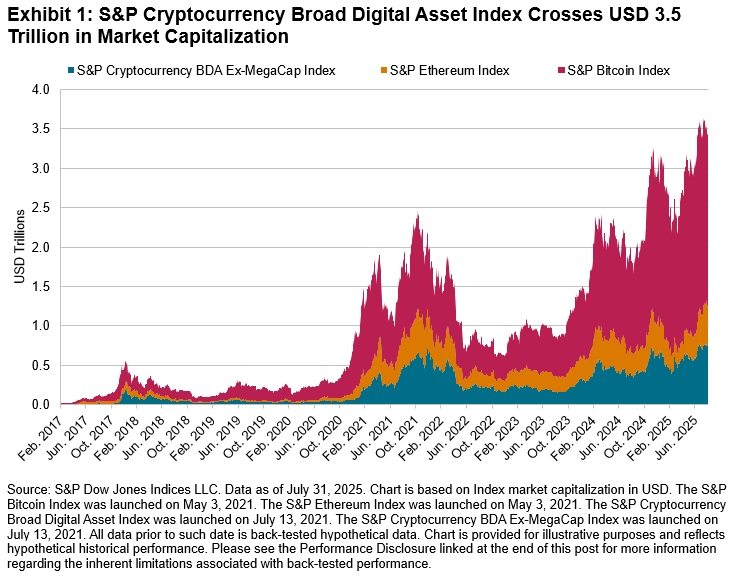 Two decades ago, crypto didn’t exist, and even a decade ago, it was still an emergent asset class. In the last few years, crypto has increased in maturity, crossing USD 1 trillion in market capitalization in 2021 and currently sitting at USD 3.5 trillion at the end of July 2025 based on the S&P Cryptocurrency Broad Digital Asset (BDA) Index. Its increased size is not the only indicator of its increasing maturity; market participants have been offered additional tools to help in their asset allocation decisions with a growing network of associated exchange-traded products, such as futures, options, ETFs and other wrappers. The crypto product ecosystem is expected to continue growing, with a robust pipeline of ETF filings globally. In addition, a shift in the global regulatory landscape for DeFi-related products is helping to create a framework for market participants in this asset class.