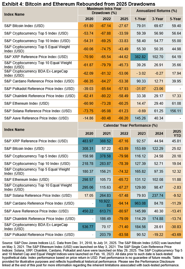 However, the journey to get there hasn’t been smooth. The resilience of the AUM growth is even more impressive against the backdrop of the crypto drawdowns at the start of 2025, which was marred by uncertainty and risk-off undertones due to geopolitical tension, tariffs and concerns around whether U.S. exceptionalism would hold. At the end of March, the S&P GSCI Gold was in positive territory, sporting a return of 18%, whereas the S&P Bitcoin Index, S&P Cryptocurrency MegaCap Index and S&P Ethereum Index were down 12%, 18% and 45%, respectively, in Q1 2025 and had an even more severe drawdown compared to their peak.