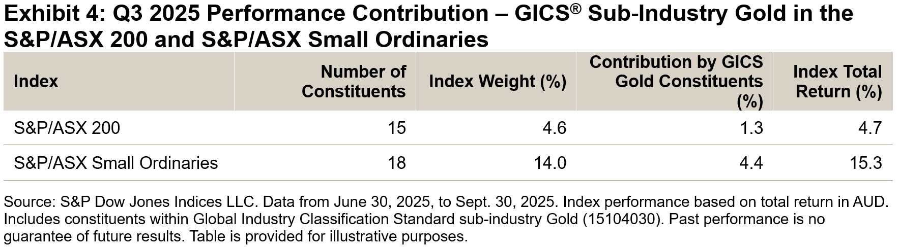 Therefore, more companies within the S&P/ASX Small Ordinaries could have a meaningful contribution to index performance when compared to the S&P/ASX 200. Exhibit 4 further breaks down performance contribution to show a comparison of gold producers in each index.